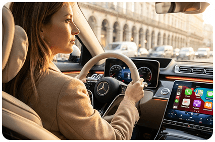 You climb in with coffee and keys, and it's already connected. The screen lights up before you even settle in.